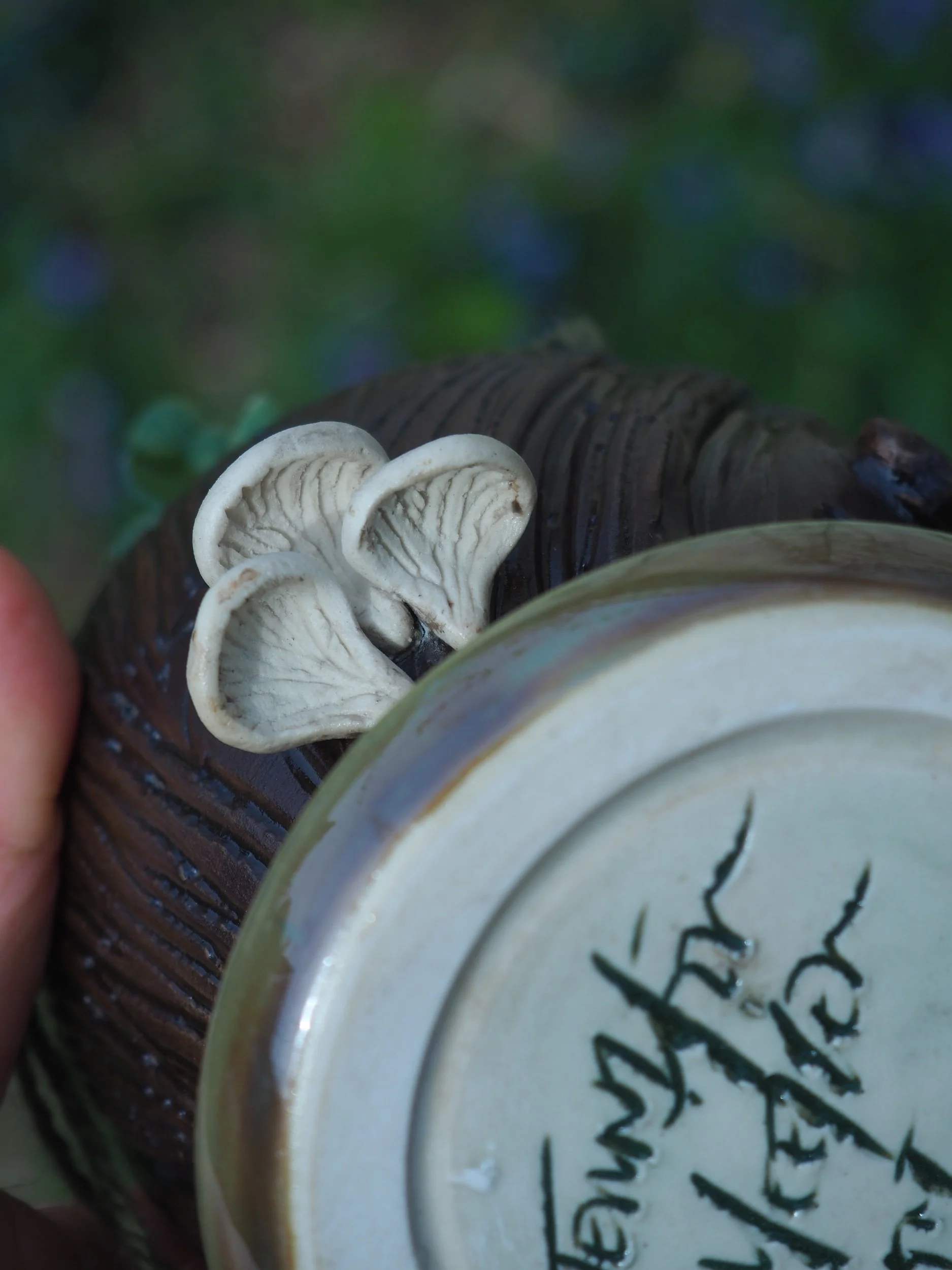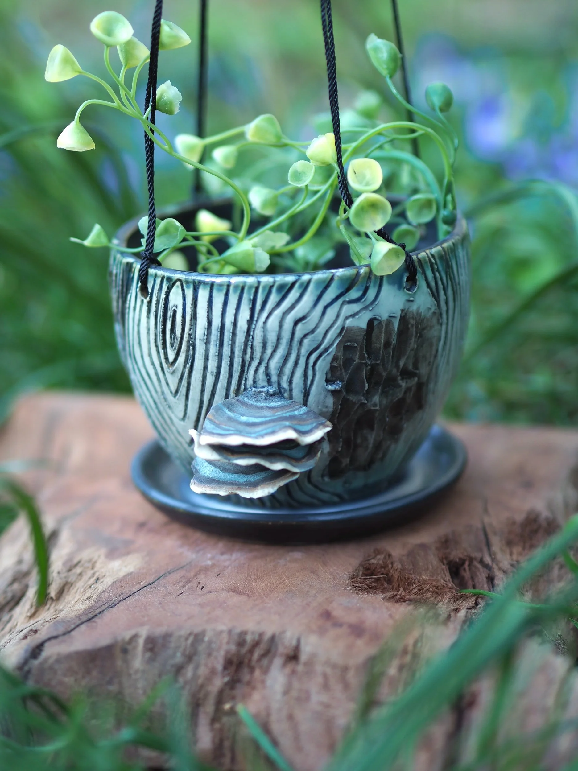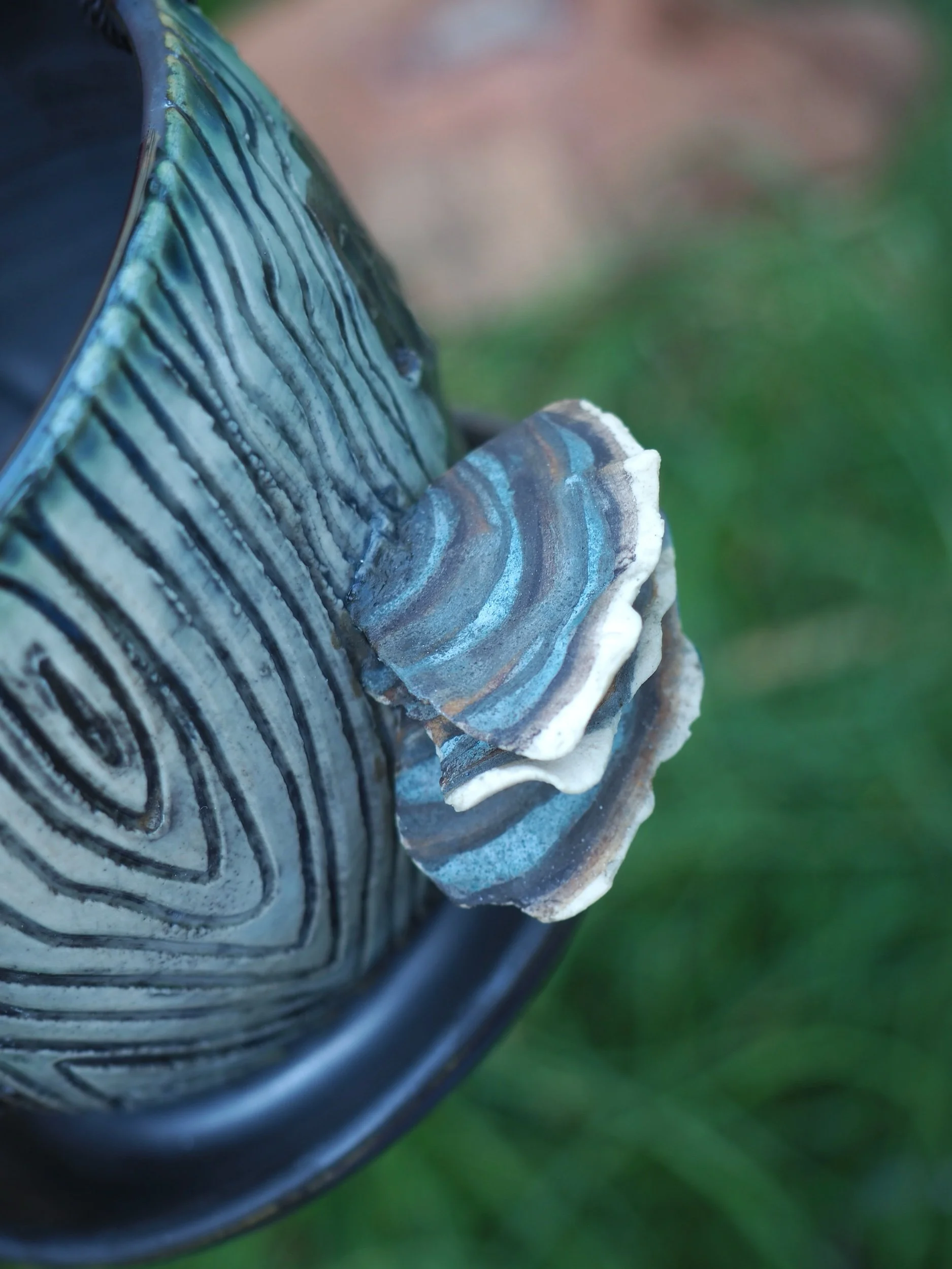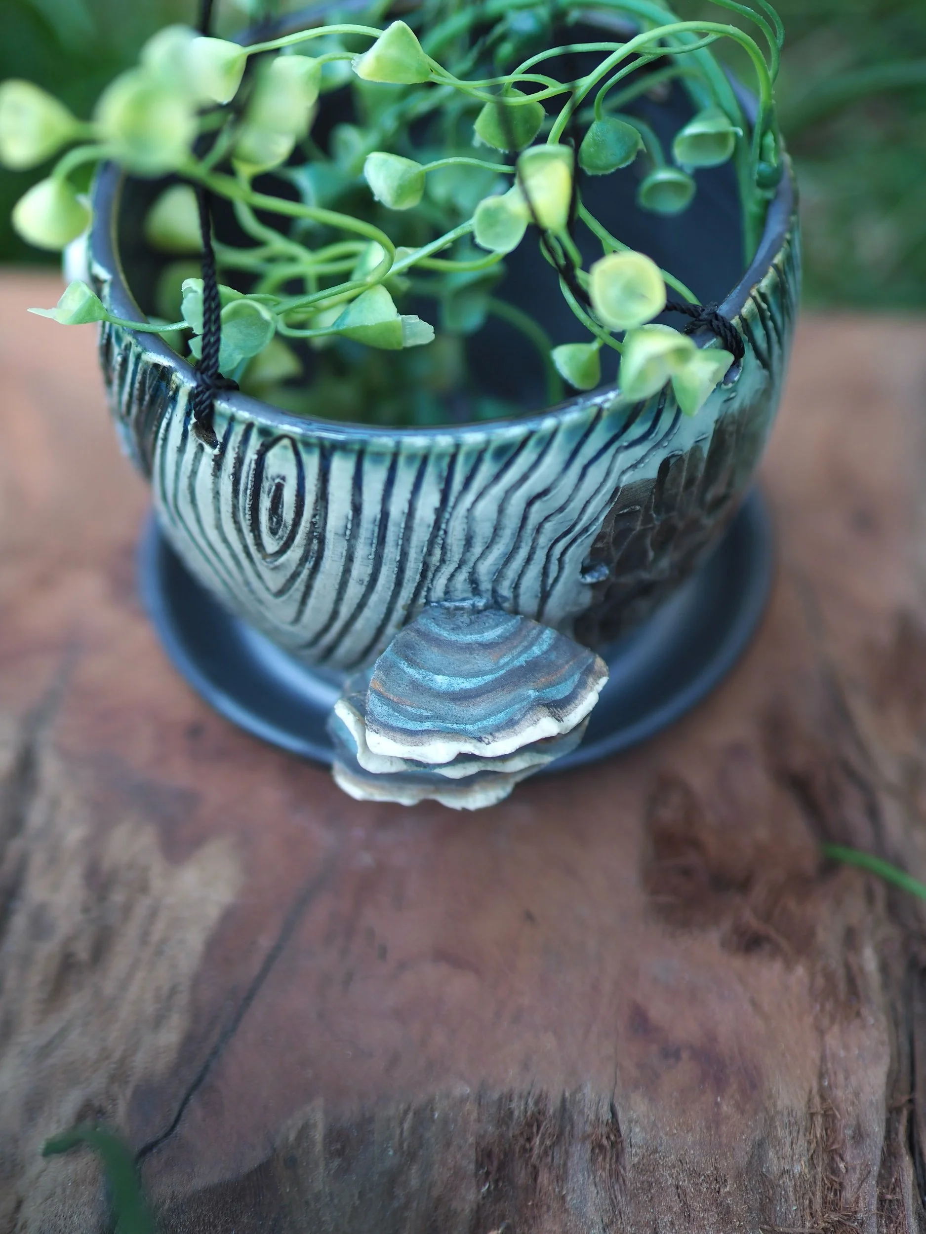 The "woodgrain" series is the artists central thesis in her work. It is inspired by the everyday telephone pole that one may see on the city streets. The woodgrain technique and effect is a signature, in which was developed solely by the artist. It is also inspired by theperfect stack of oyster mushooms she finds nearly year round. She loves the variety of shades they can come in, but inthe summer months, a soft white color pictured here. Also she loves the amount that she forages for, giving her enough to eat and turn into medicinal powders and tintures through the winter months . She designs these so there is proper drainage and an attached water dish to collect the water- a two in one!