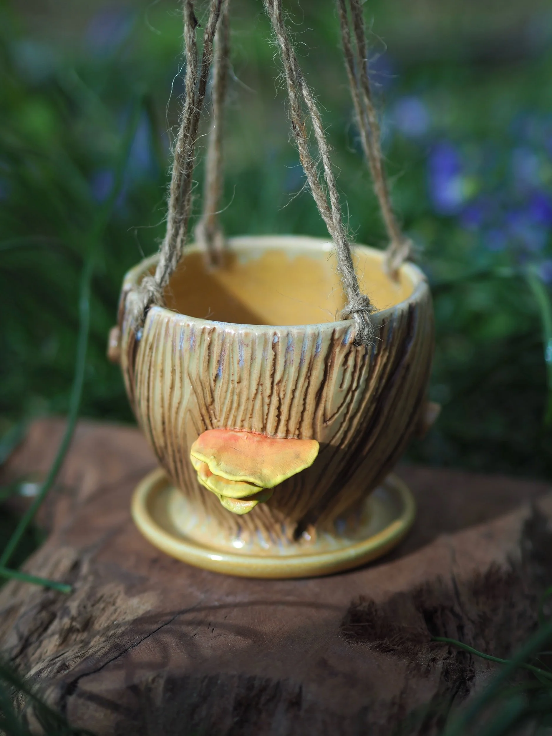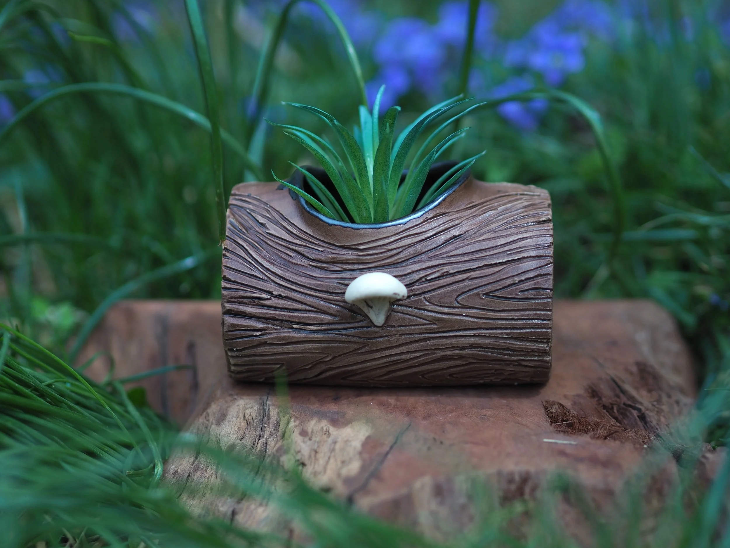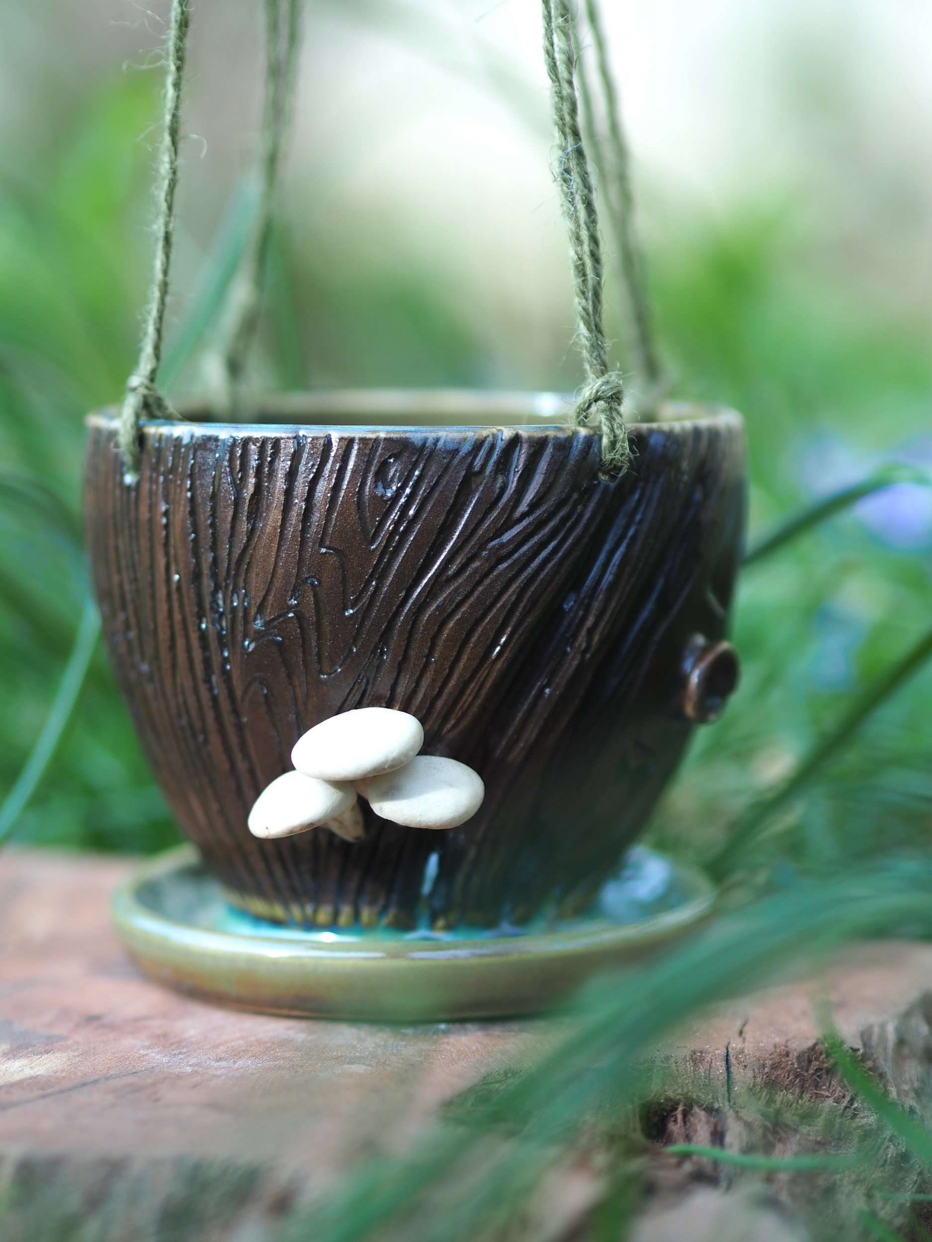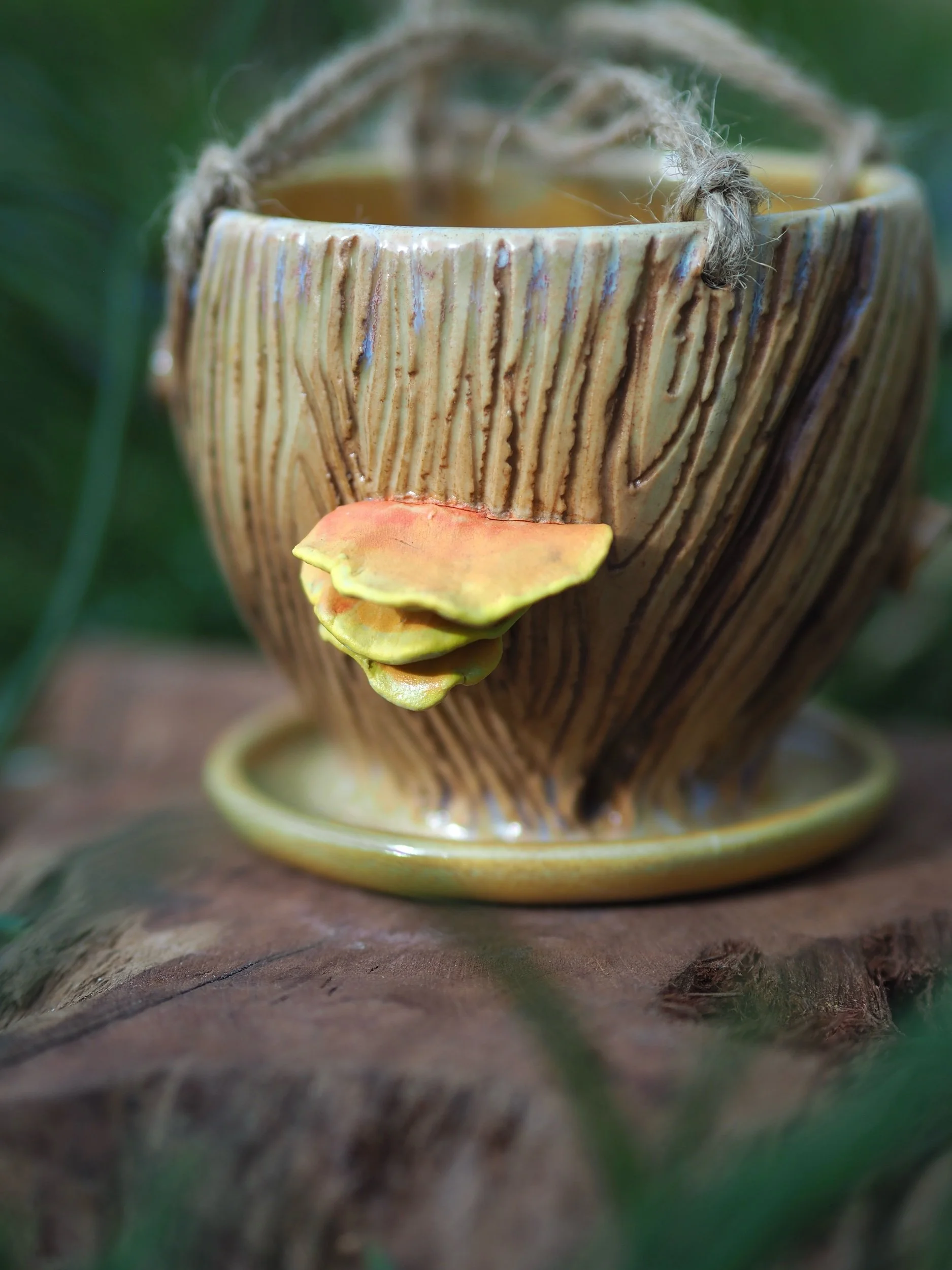 The "woodgrain" series is the artists central thesis in her work. It is inspired by the everyday telephone pole that one may see on the city streets. The woodgrain technique and effect is a signature, in which was developed solely by the artist. It is also inspired by theperfect stack of oyster mushooms she finds nearly year round. She loves the variety of shades they can come in, but inthe summer months, a soft white color pictured here. Also she loves the amount that she forages for, giving her enough to eat and turn into medicinal powders and tintures through the winter months . She designs these so there is proper drainage and an attached water dish to collect the water- a two in one!