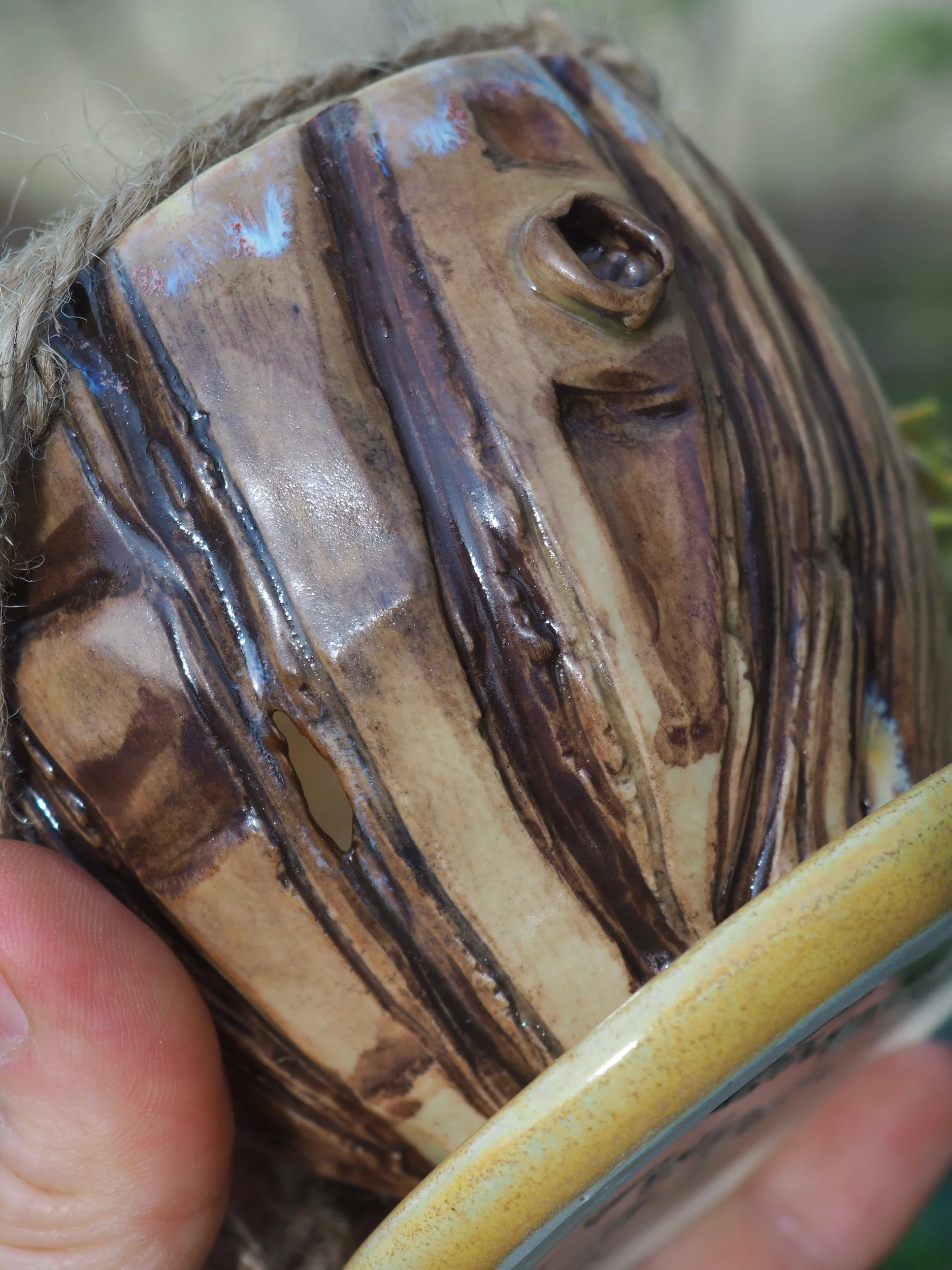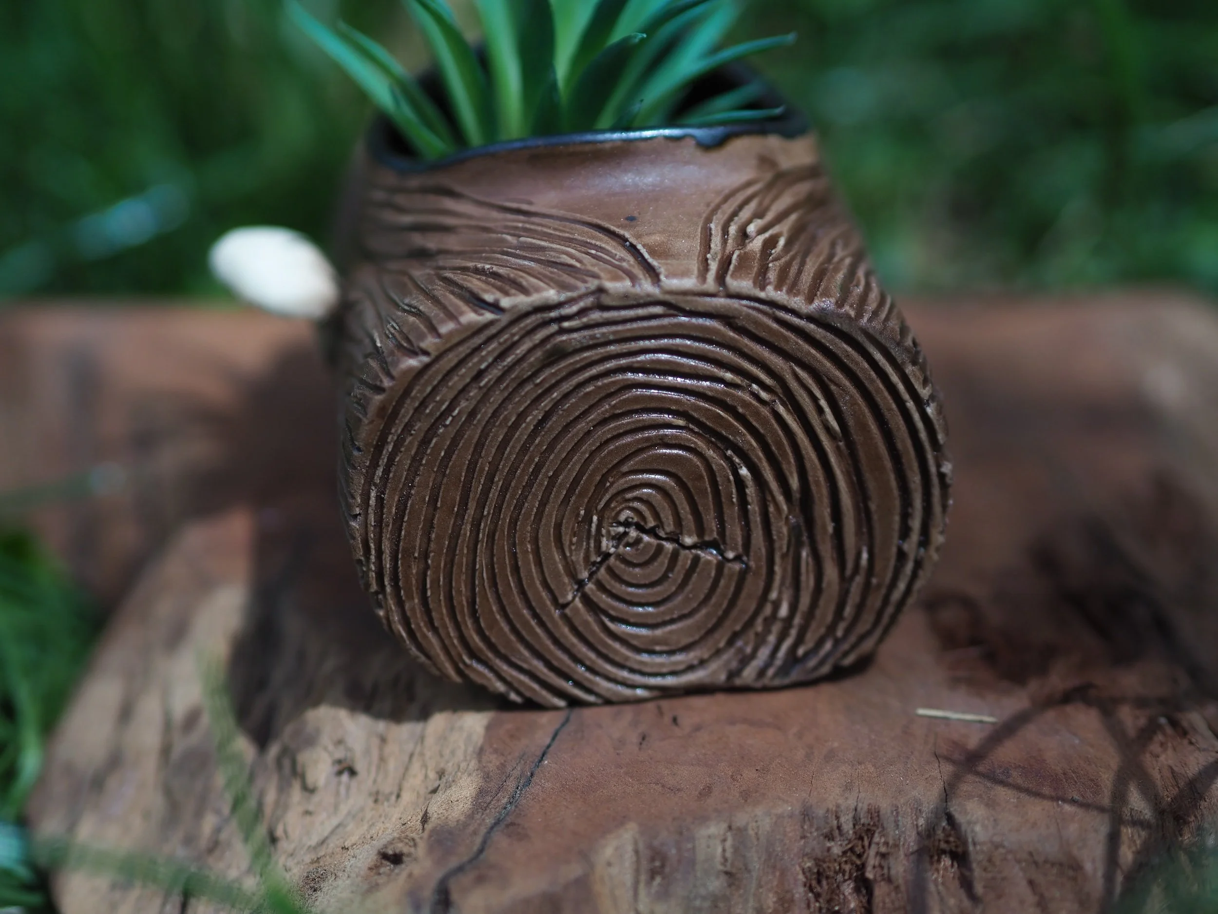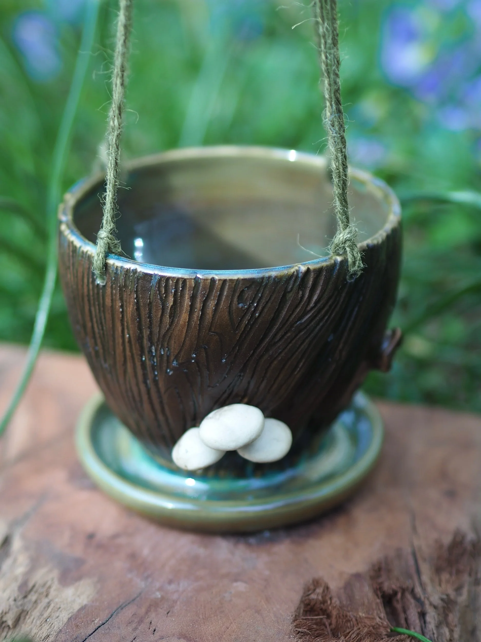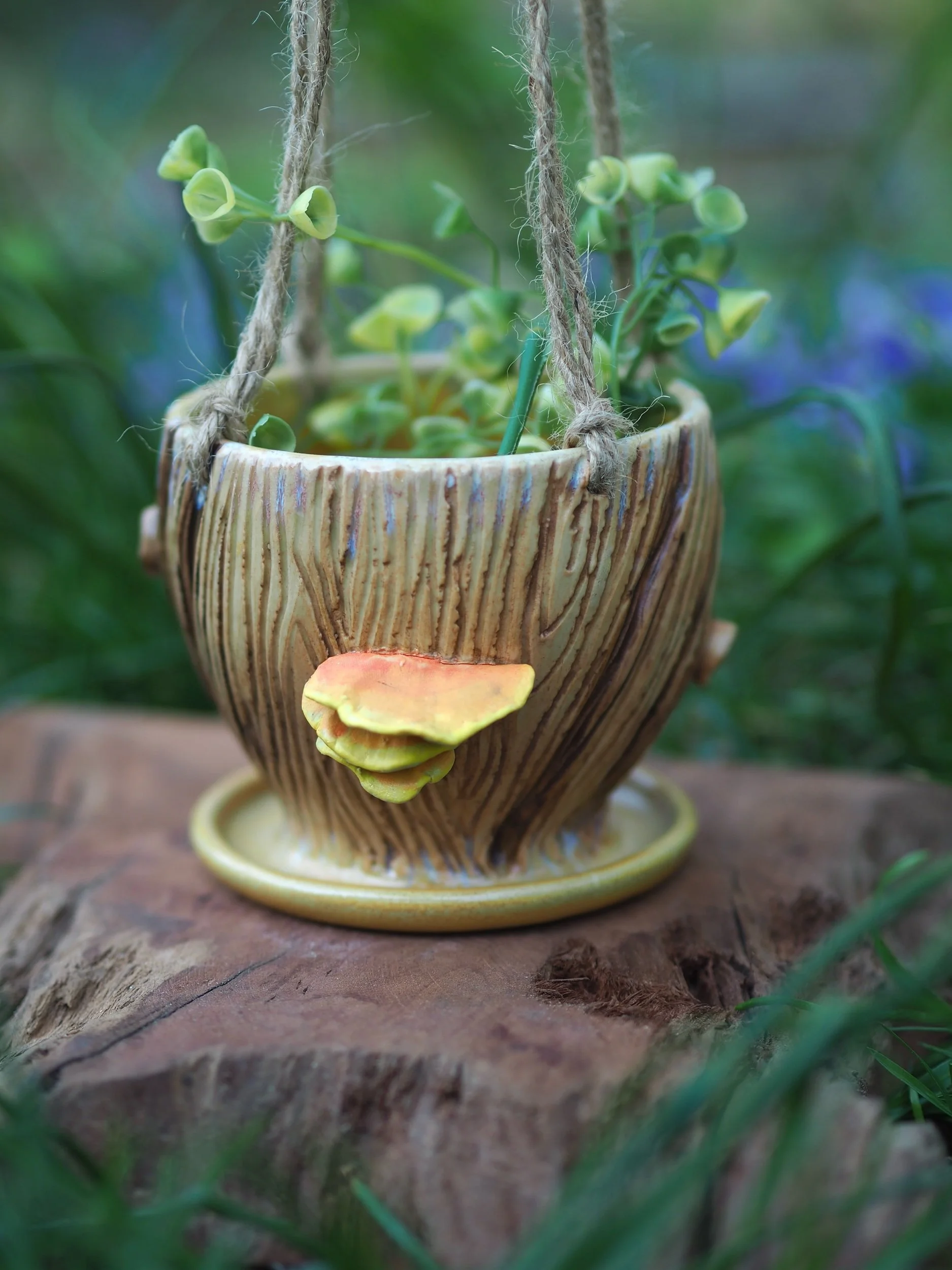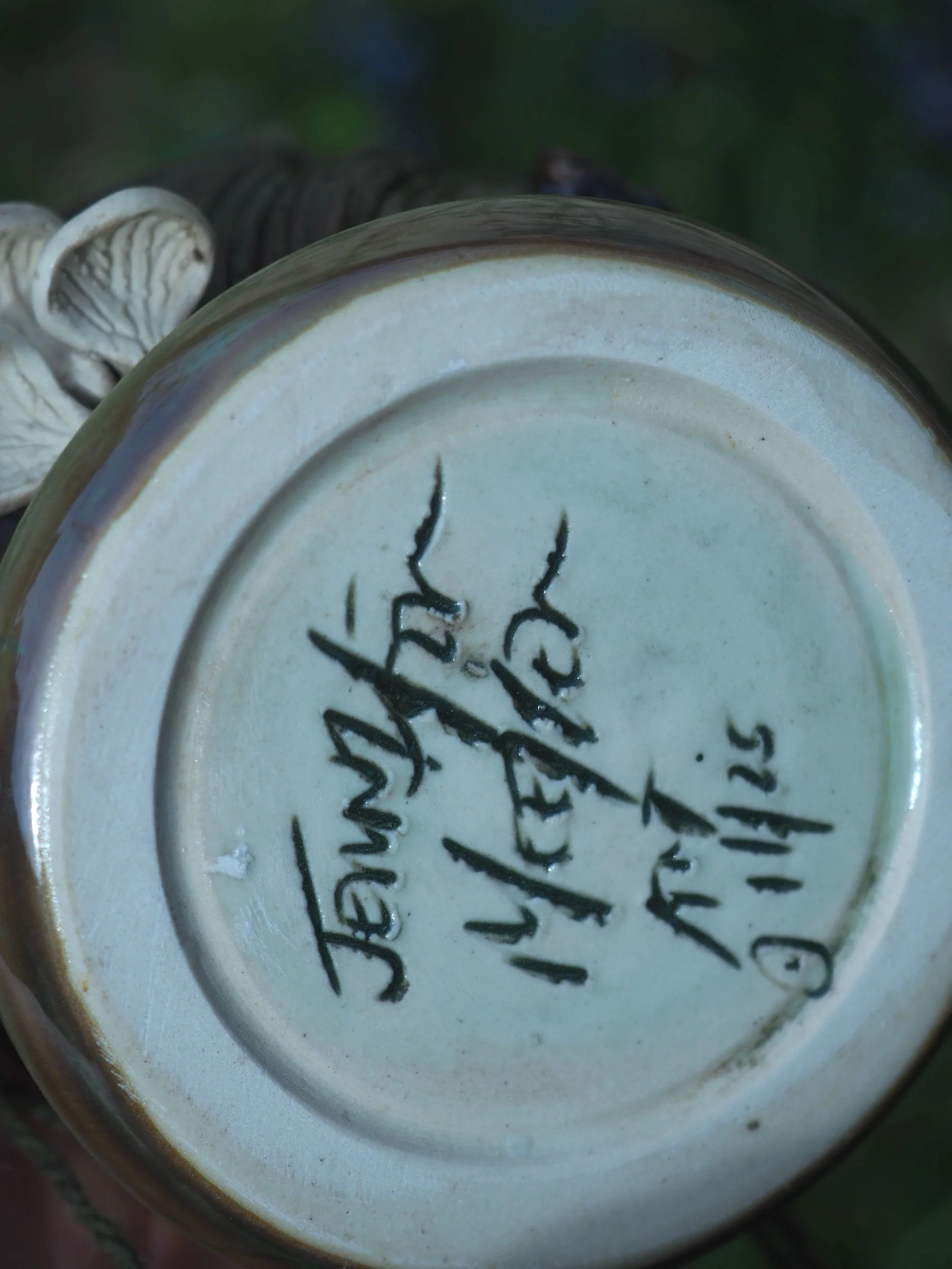 The "woodgrain" series is the artists central thesis in her work. It is inspired by the everyday telephone pole that one may see on the city streets. The woodgrain technique and effect is a signature, in which was developed solely by the artist. It is also inspired by theperfect stack of oyster mushooms she finds nearly year round. She loves the variety of shades they can come in, but inthe summer months, a soft white color pictured here. Also she loves the amount that she forages for, giving her enough to eat and turn into medicinal powders and tintures through the winter months . She designs these so there is proper drainage and an attached water dish to collect the water- a two in one!