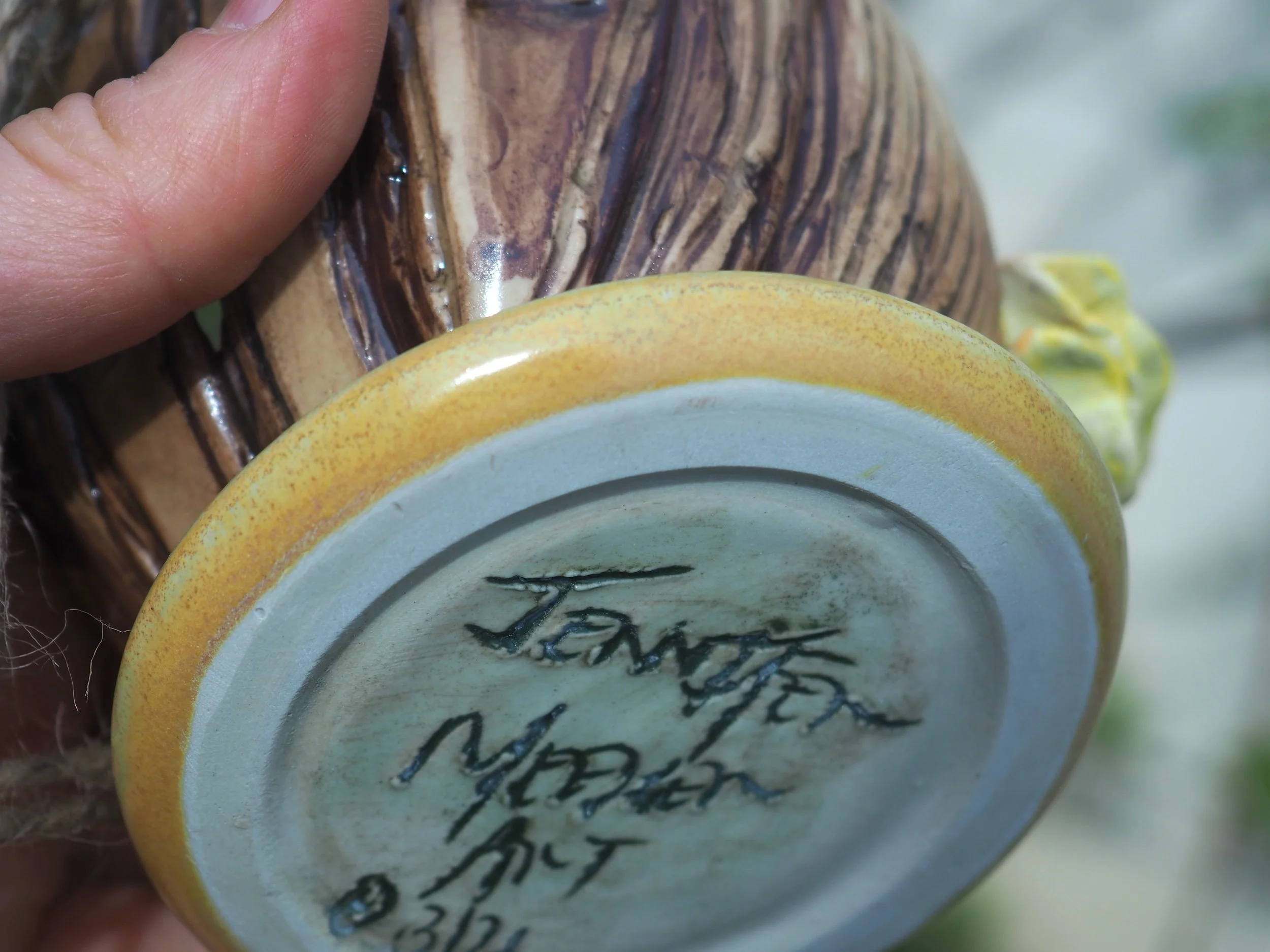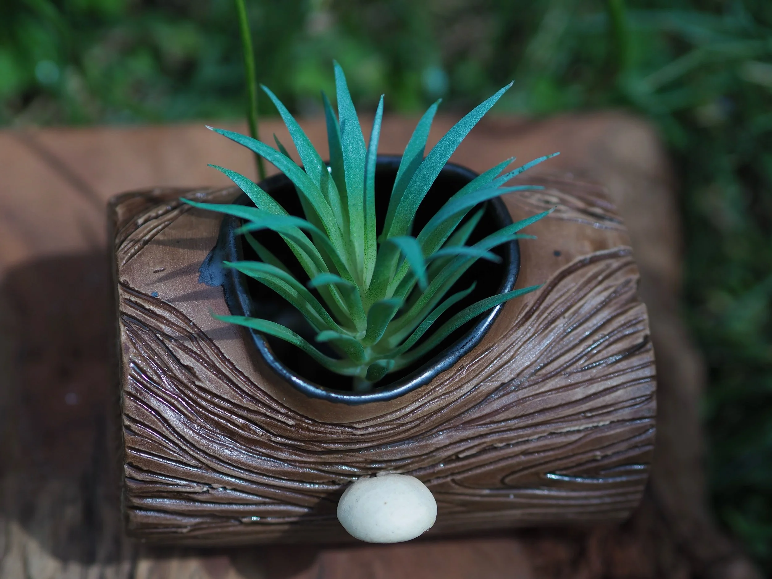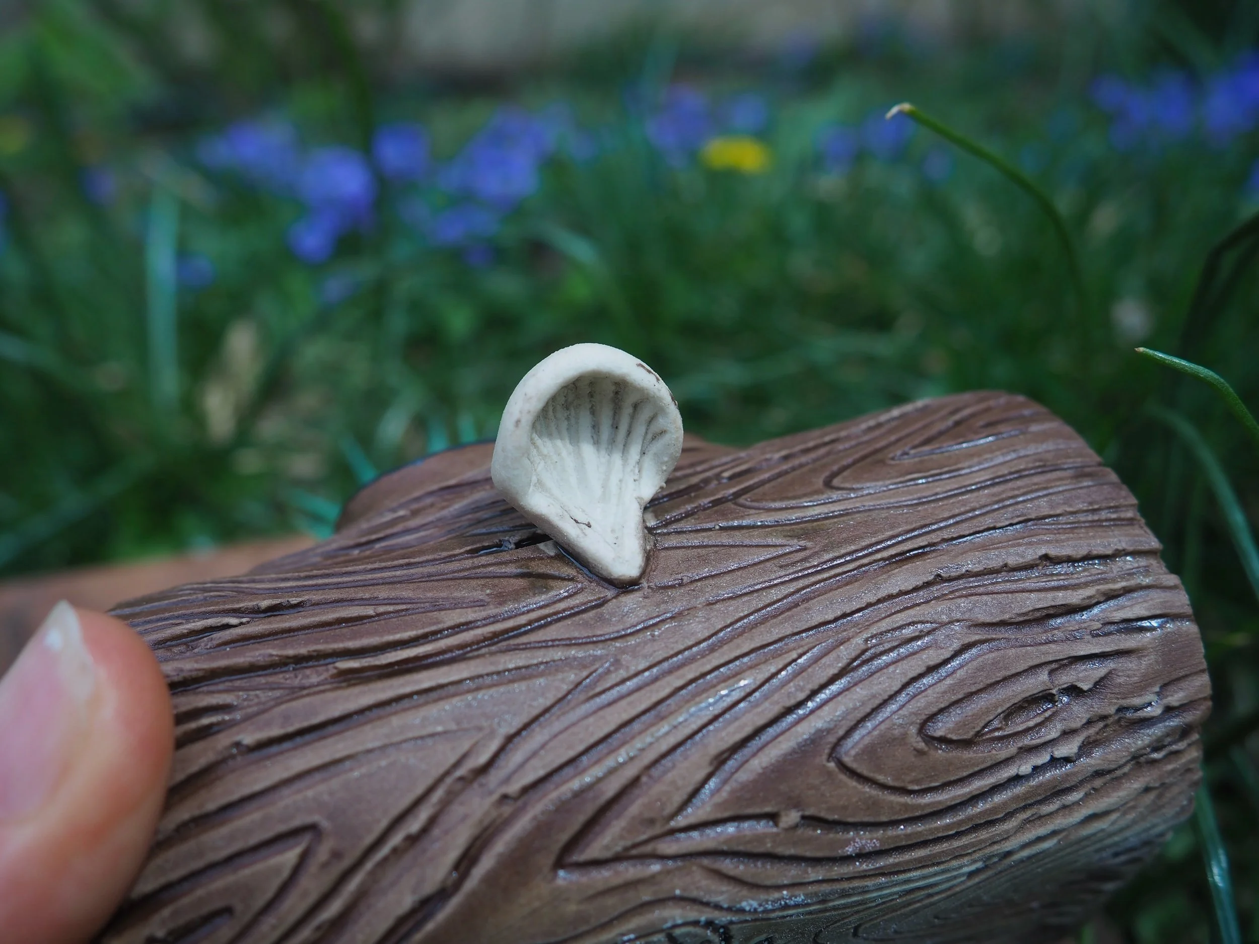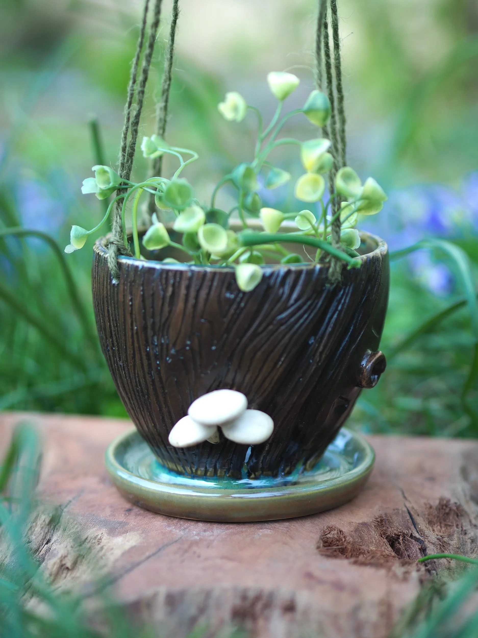 The "woodgrain" series is the artists central thesis in her work. It is inspired by the everyday telephone pole that one may see on the city streets. The woodgrain technique and effect is a signature, in which was developed solely by the artist. It is also inspired by theperfect stack of oyster mushooms she finds nearly year round. She loves the variety of shades they can come in, but inthe summer months, a soft white color pictured here. Also she loves the amount that she forages for, giving her enough to eat and turn into medicinal powders and tintures through the winter months . She designs these so there is proper drainage and an attached water dish to collect the water- a two in one!