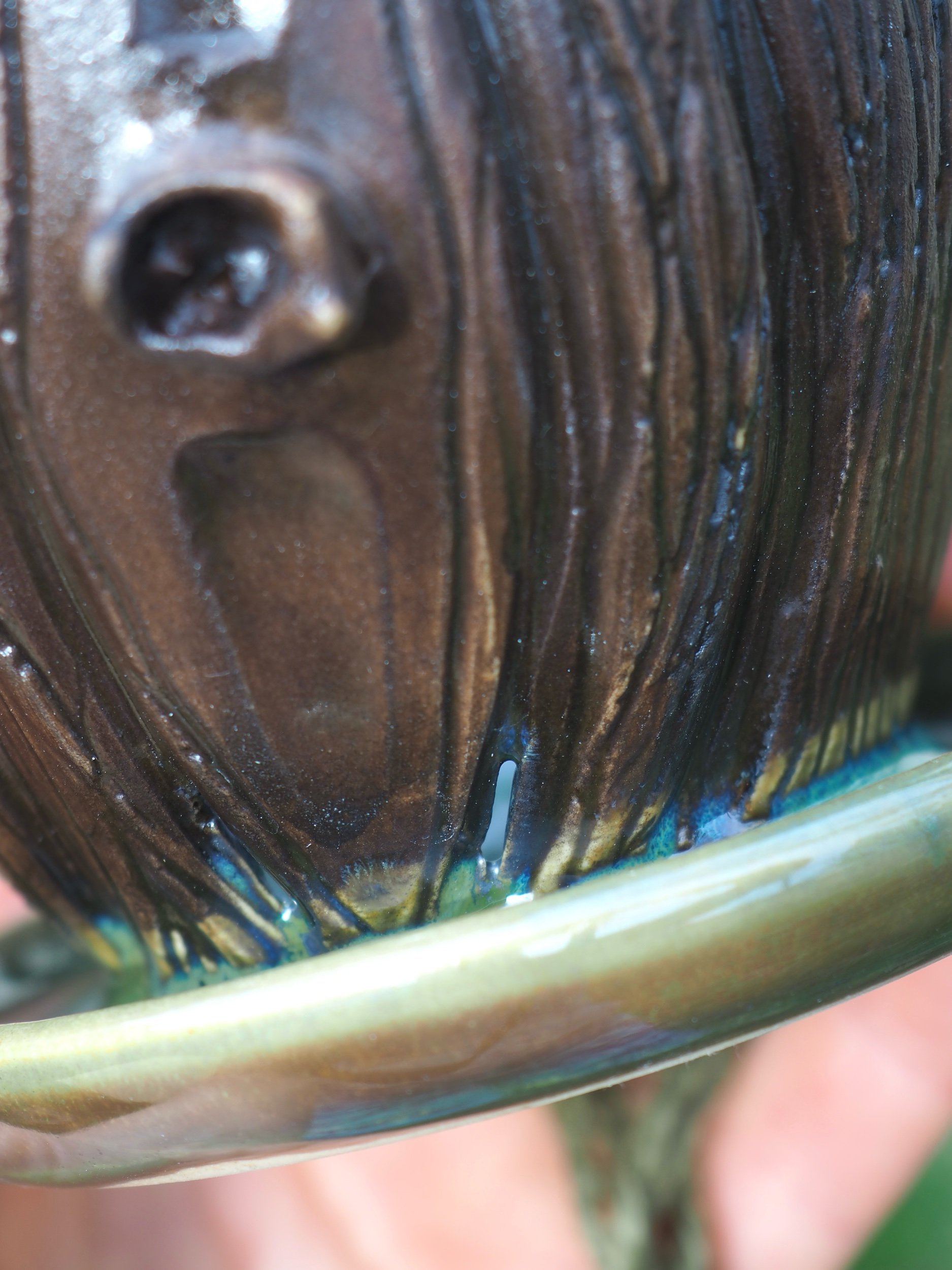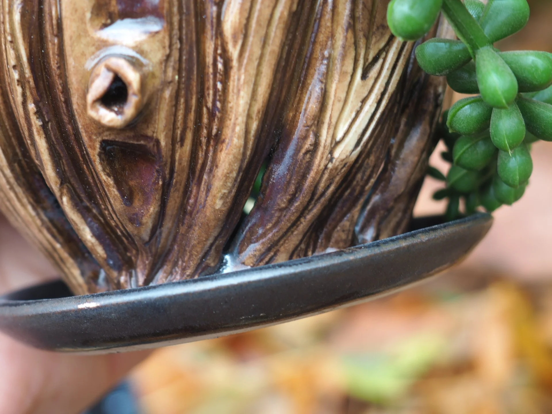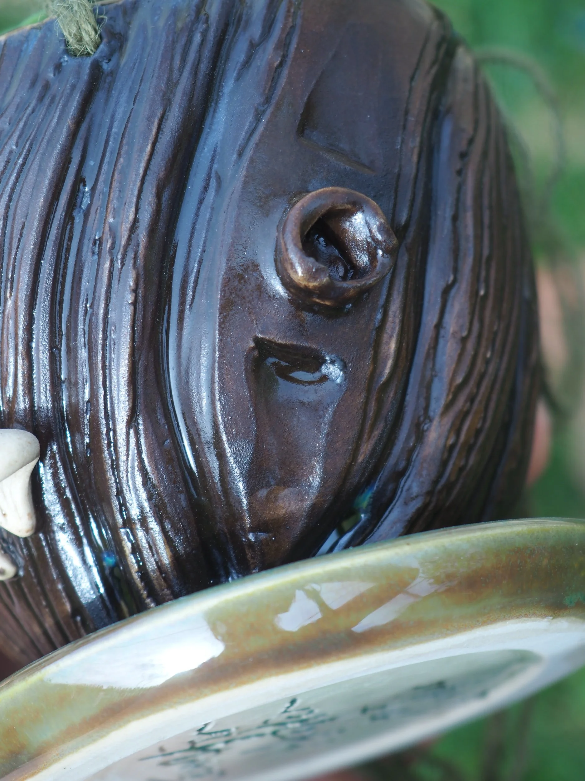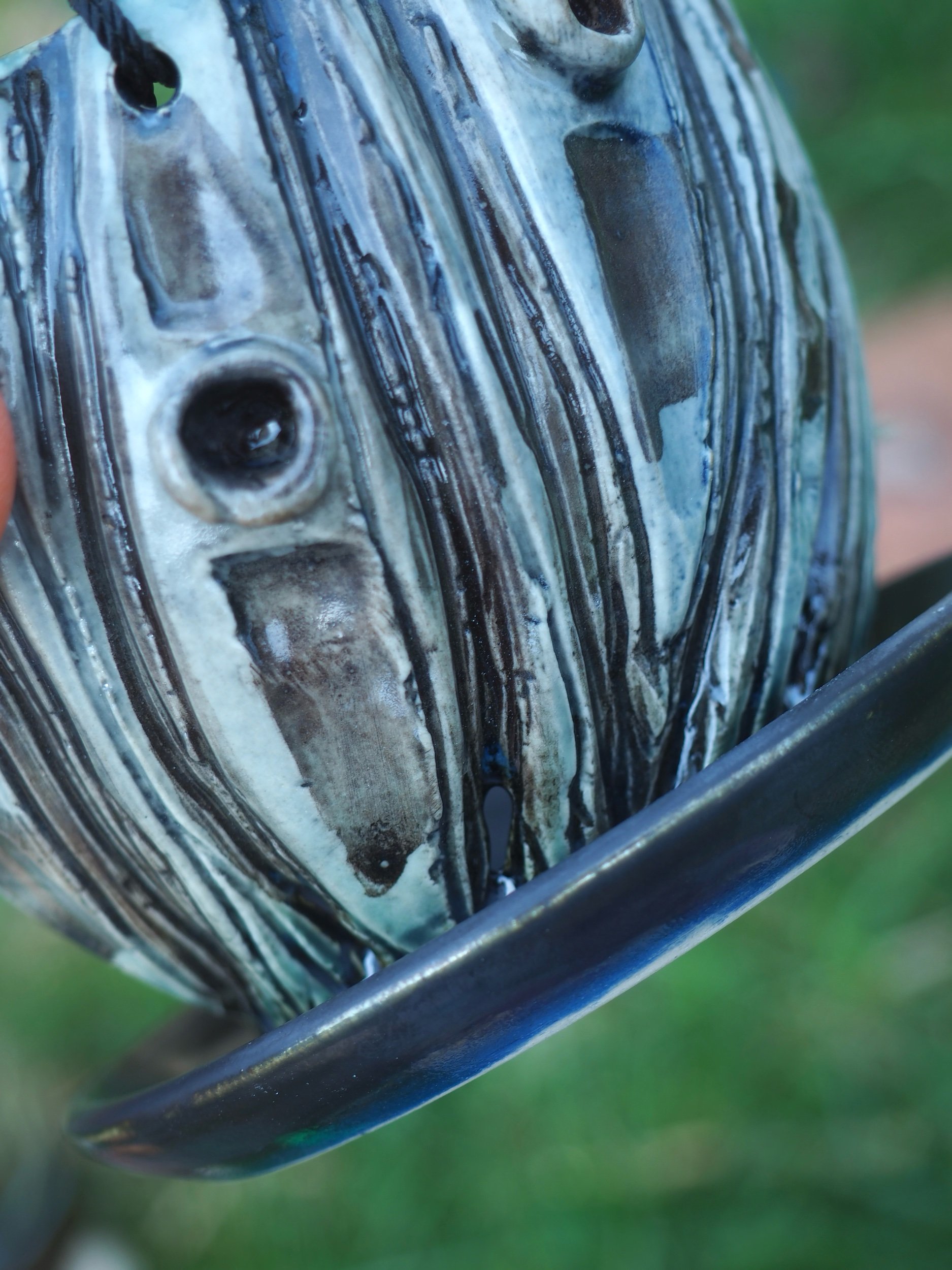The "woodgrain" series is the artists central thesis in her work. It is inspired by the everyday telephone pole that one may see on the city streets. The woodgrain technique and effect is a signature, in which was developed solely by the artist. It is also inspired by theperfect stack of oyster mushooms she finds nearly year round. She loves the variety of shades they can come in, but inthe summer months, a soft white color pictured here. Also she loves the amount that she forages for, giving her enough to eat and turn into medicinal powders and tintures through the winter months . She designs these so there is proper drainage and an attached water dish to collect the water- a two in one!
