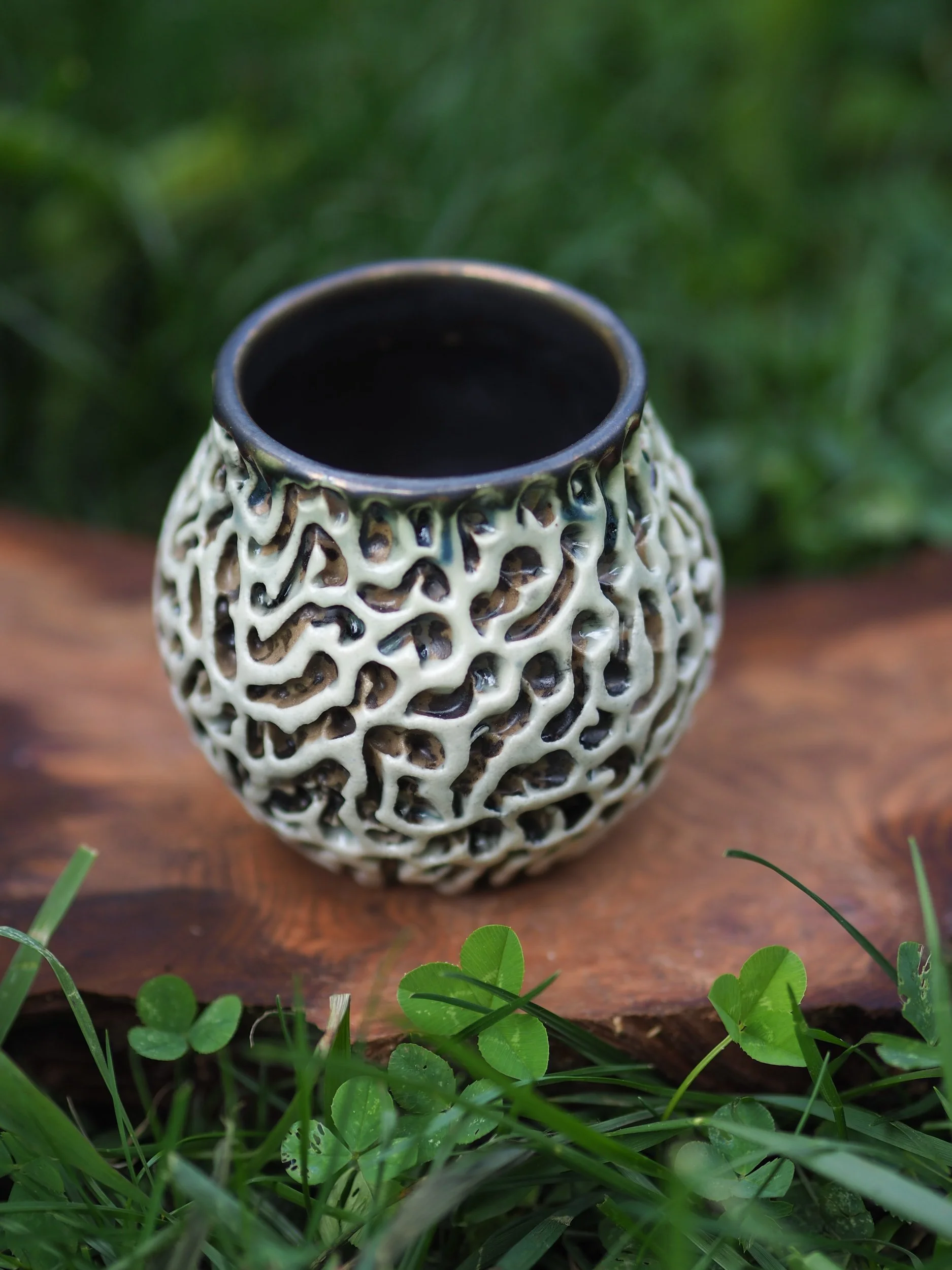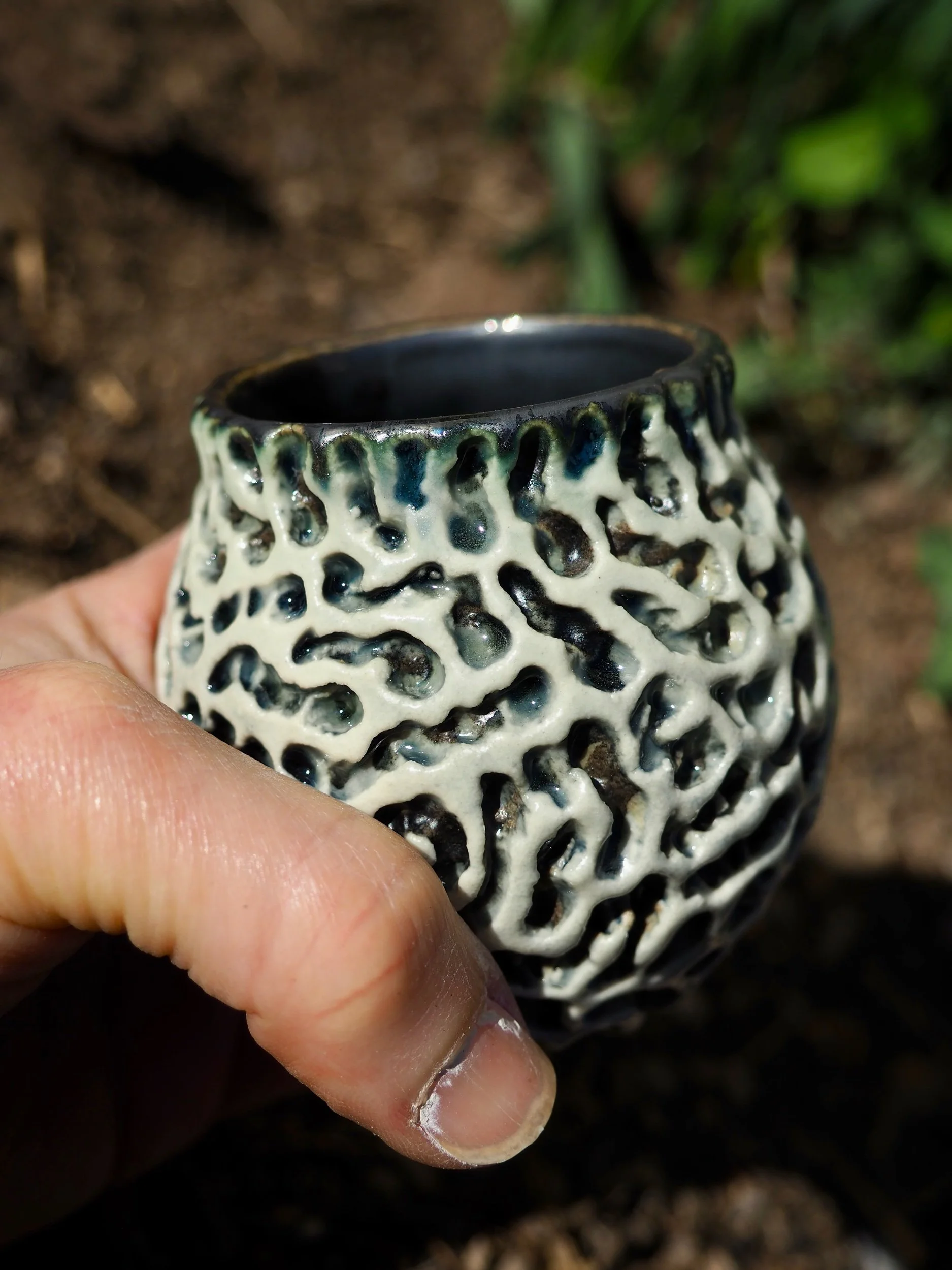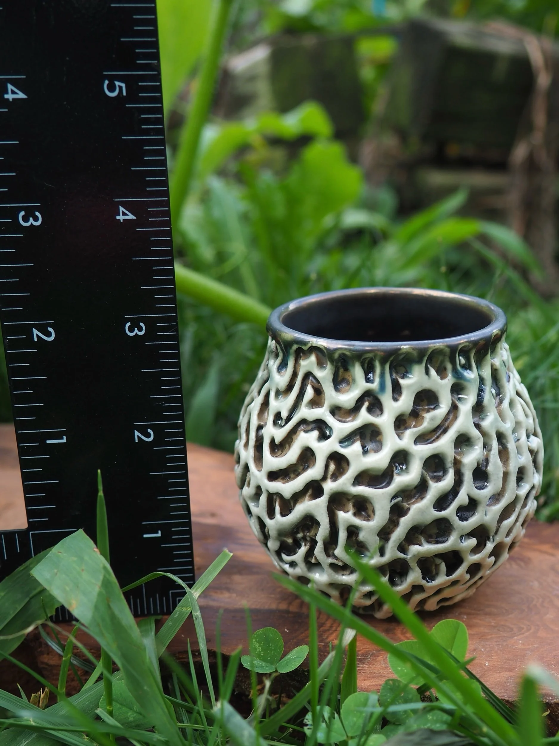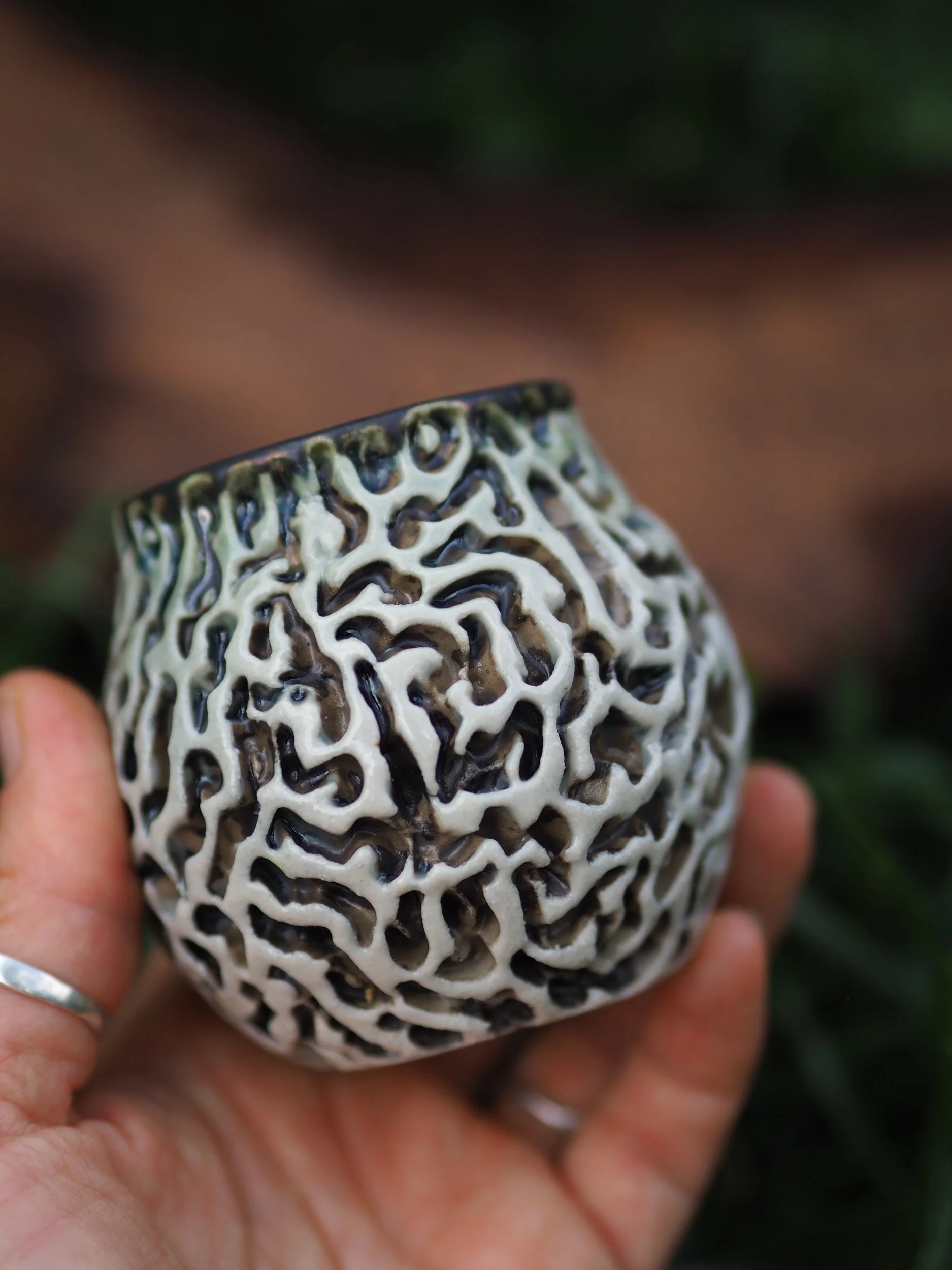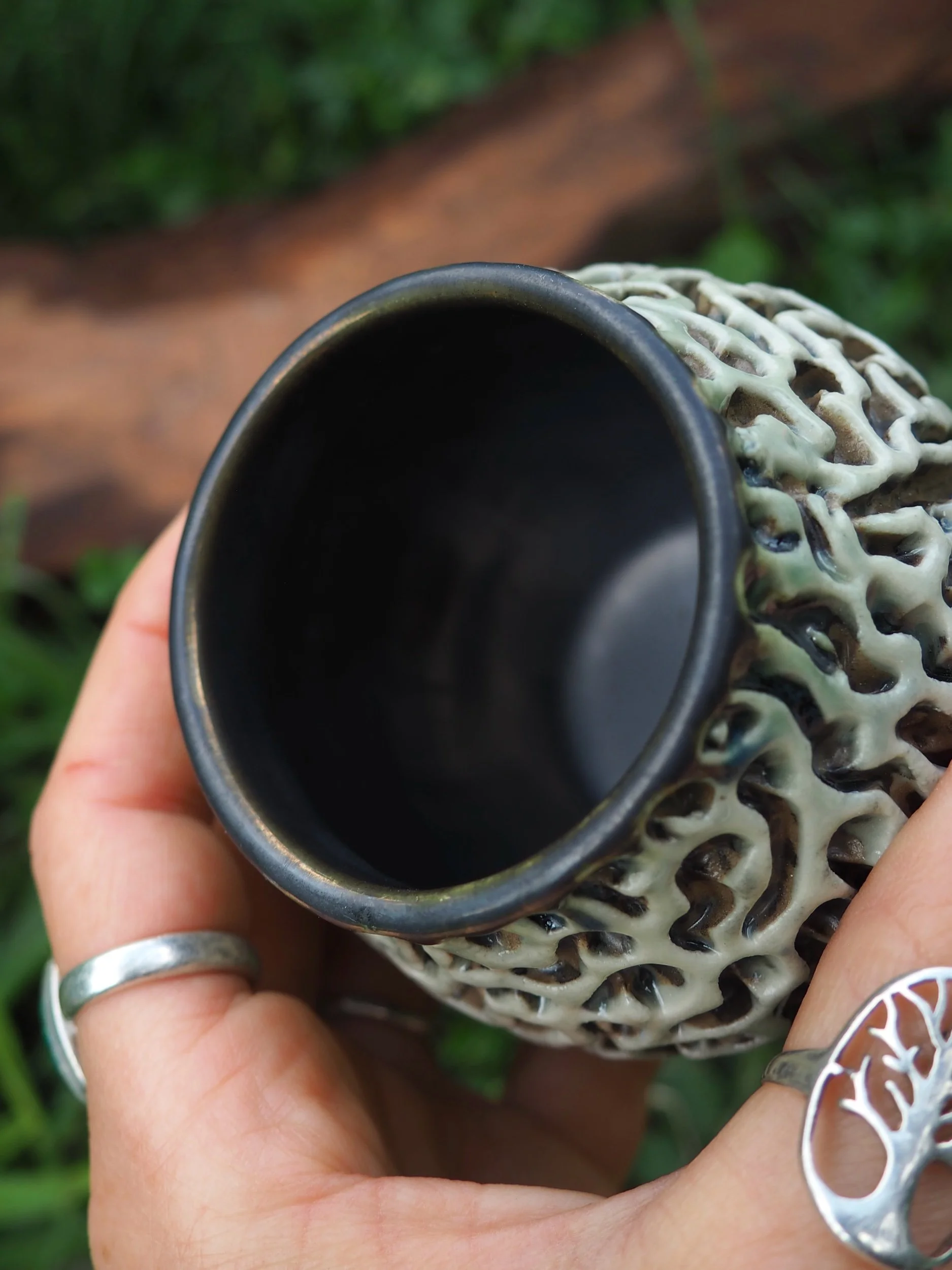 She is inspired by the little creations nature has coming out of the forest floor in springtime; morel mushrooms. She is also a “morel mushroom expert” in Indiana and educates people through foraging classes in the spring. She incorporates the detail, texture, and color of the gray morel into a hand-made and hand-carved piece. Each one of her pieces goes through countless steps to achieve this realistic look, including two kiln firings to cure the pieces, making them safe and durable for everyday use. The artist purposely made these without a handle- it has a thick enough texture so you can have your coffee in it to warm your hands AND pet your mug! A functional satisfying piece of art!